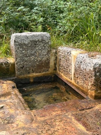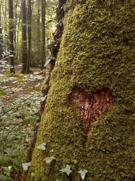 Later in the week, on Tuesday, we walked through the forest near Belforêt-en-Perche to find the Fontaine de la Herse. The site consisted of two landscaped basins ringed by six sandstone blocks; on two of them, Latin inscriptions translated as “To Aphrodite” and “Consecrated to the lower deities, to Venus, Mars and Mercury”. It was a small Gallo-Roman sanctuary in a clearing, its stones darkened by their time in the water. In the forest, rain nibbled at the leaves and the path softened underfoot. When we stopped by the side of the path, I noticed a heart-shaped patch of moss on a tree, a deer with wings on a waymarker and several stacks of cut logs waiting to be taken away. I wanted to roll the ends of those logs with ink and press them onto a large canvas, to see if I could keep their intricate rings forever if they were only going to be burnt or chomped into chippings. We ended the walk with chips and a beer, a hot, salty round off to all the green and grey.