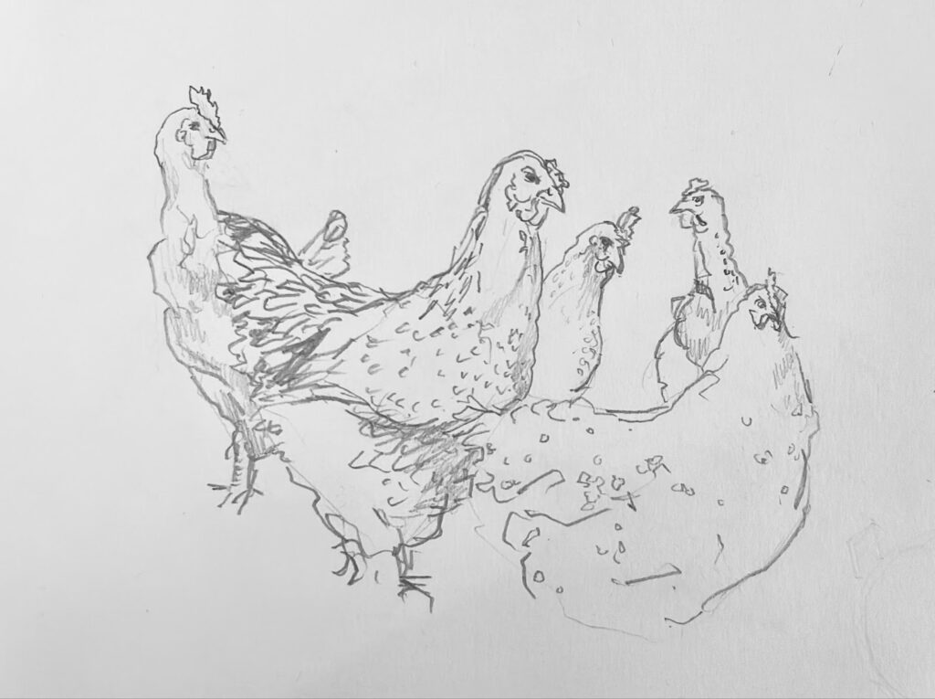 The next morning, tractors in the neighbouring field pulled us awake. We had coffee in the sun, spooning sugar from the tarnished yellow tin. Louise and I went down to see the horses, (she enjoyed feeding the smaller one green apples) and we managed to free a tiny blackbird from a wire trap. We collected eggs from the chickens, while Pop set up his easel, painting the house from different points in the garden at different times of day, tracking the light like a human sundial. The house itself had old beams and plain corniced walls, and a long, benched dining table in the kitchen that invited chopping and spreading and laying out. Lunch was crisp baguette with slabs of salted butter and a salad of roughly chopped beef tomatoes – tomatoes that tasted briefly, insistently, of having been somewhere else that morning. They were drowned in olive oil, splashed with balsamic, and finished with a generous throw of salt and purple basil snipped from the herb bed by the back door. We ate cantaloupe melon afterwards. In the evening Jérôme scattered thyme onto the fire while he cooked the meat, and we drank wine from Bourgogne while Jacques Brel and “Alexandrie, Alexandra” by Claude François triggered tipsy singing round the table. A dozen lanterns hanging from the nearby trees cast small, steady circles on the floor, encouraging the night to move on inverted wings, aloft.