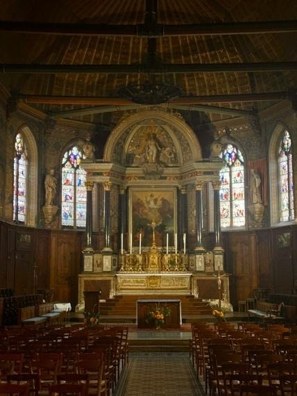 From there, we drove on to La Chapelle-Montligeon to see the Basilica of Notre-Dame de Montligeon, a muted stone structure set against open countryside. Inside, the space was high and white and full of gathered light. Nuns dressed in white moved quietly between the pews, a line of similarly dressed children followed. During our visit, a choir rehearsal filled the nave with children’s voices that rose easily into the vaulted ceiling. I didn’t understand the words, but the sound travelled along the ribs and arches of the building, and it was enough just to sit and listen.