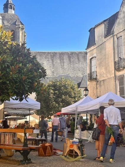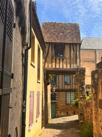 On Saturday morning, the bells of the Church of Saint-Sauveur spilled over tiled roofs into the Place de la République, drawing locals and visitors toward the weekly market. I followed the crowd through the stone archway and into the square, where garlic hung in thick, snug bundles and plump, grooved tomatoes blushed against half-timbered façades. Artichoke petals were lilac at the tips and tiny fresh radishes a deep pink. The sun was beginning to press down, and I swallowed the warm air in giant gulps. Stalls meandered across the square; at the far end, books and frames lay on the cobbles beside a pottery stall, crates of records and more antiques. My favourite piece there was a handcrafted rocking horse with a burnt-red saddle. A breeze tried to lift it into motion but only nudged it upwards so it looked permanently on the verge of rearing and bolting down the hill.