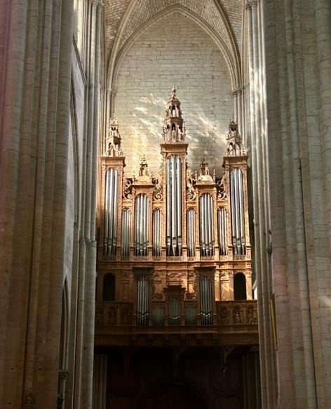 On our last day we drove an hour or so out to Le Mans and climbed up into the Plantagenet City. At the Place des Jacobins market, stalls were packed close together, selling old stamps, enamel pins, waxy paintings and hundreds of second-hand books. Watches and jewellery cases glinted on blue tables, and beautifully carved violins leaned against their cases in the sun. The town hosted a medieval festival each year, but we had just missed it, though we could sense the anticipation for banners to be raised in the following days. We crossed the square and followed the old town’s narrow, colour-beamed streets as they rose towards the cathedral.  Along the way, we spotted a carved doorway depicting Adam and Eve which stood beneath a teal-framed window, where a scruffy dog had wedged its head between the shutters and was almost dribbling down onto the cobbles below.