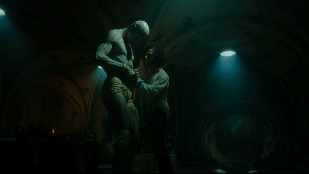 If Elordi’s portrayal of the Creature is one marked by reaction and response, it is also marked in consequence by movement. His manner of gesture is informed by the hypnotic, uncanny cadence of Japanese butoh, as well as the doggish behaviours of his beloved retriever and faithful set-companion Layla. In this simple, unselfconscious, animal humility there is a virtue and an innocence of religious quality. ‘He reacts to love with love … to hatred with hatred,’ del Toro explains – an ethics of basic reciprocity which engenders purity. This unhurried curiosity of interaction counters with stark contrast Oscar Isaac’s taut and fevered Victor. He is intellect void of commitment, perpetually at odds with the irregular impulse of his own weak solicitude; he creates for the sake of saying he has done so. His creation, instinct shot through with affection, is the resultant victim.