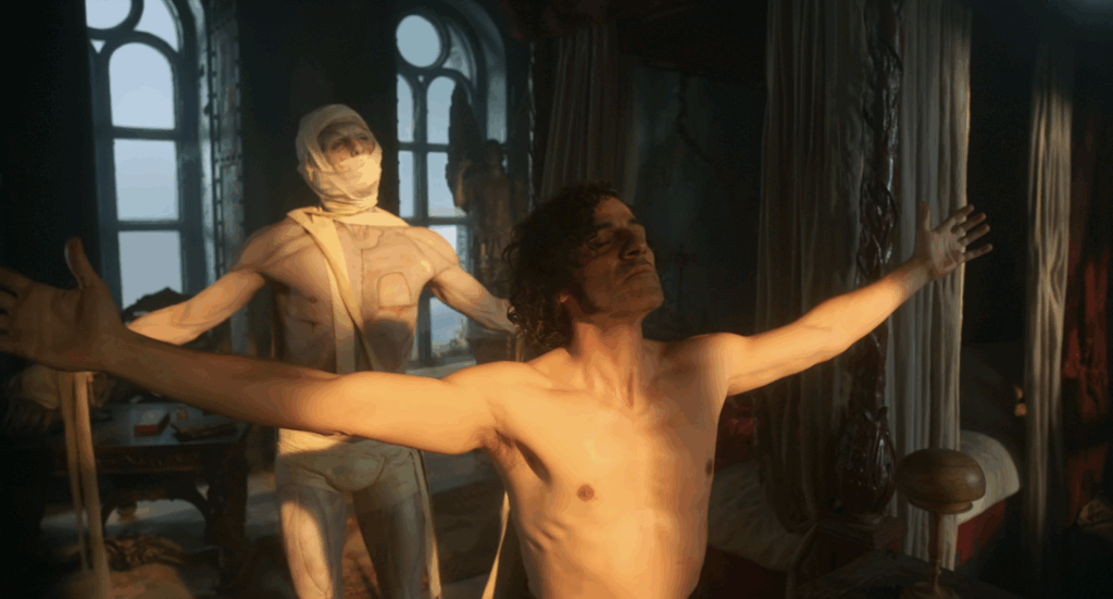 Jacob Elordi’s embodied performance of the Creature communicates this brilliantly. Ache is privileged over shock. The infant fury of an unloved child over the stupid, square-jawed, bolt-studded zombie we may be accustomed to. Through Elordi, the Creature’s anatomy becomes a palimpsest of failed affections. Each tendon and tremor inscribes the trauma of lost intimacy: a virgin sorrow, a betrayed commitment, a nascent rage. When we are first met with del Toro’s vision of the Creature, he is slack-jawed, his limbs unsure, his torso enormous yet quivering. Each gesture seems borrowed, as though he must study himself in order to move. The Creature’s entire education is conducted through this oscillation between contact and withdrawal. His physicality, as Elordi constructs it, is a grammar of approach. When he moves, it is always toward; the great sorrow is his misplaced faith in reciprocity. One senses in this rendering of the character the raw metaphysics of want in its most primitive state – a desire unmoralised and unnamed, simply occurring.