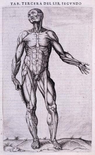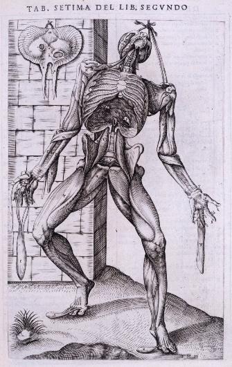 Andreas Vesalius, Male écorché (1556) / Anterior view of dissected muscle man, suspended (1556)